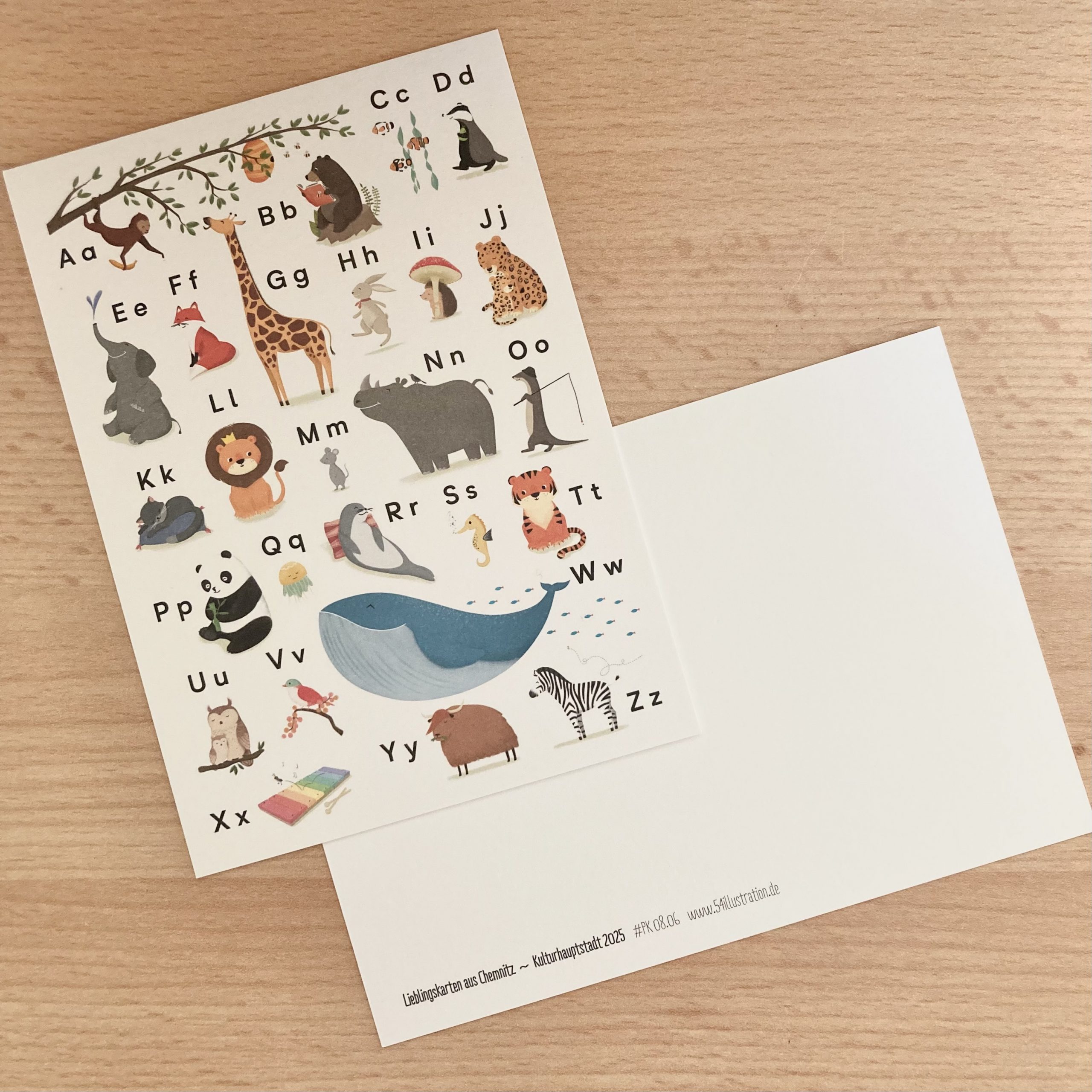 Diese Postkarte (Maße: 14,8 x 10,5 cm) mit einem zauberhaft illustrierten Tieralphabet ist von A bis Z schön anzusehen.
